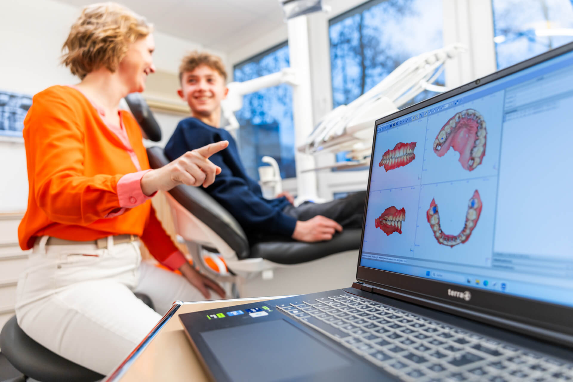 Schon während des Scans entsteht auf dem Bildschirm ein detailgetreues, digitales 3D-Modell der Zähne. Kinder können ihre Zähne dabei direkt am Monitor betrachten, und wir nehmen uns gerne Zeit, alle Fragen rund um den Abdruck zu beantworten. Die gewonnenen Daten werden unmittelbar an unser Praxislabor übermittelt. Dort nutzt der Zahntechniker die hochpräzisen Informationen, um Zahnfehlstellungen zu korrigieren und die Kieferachse optimal auszurichten.